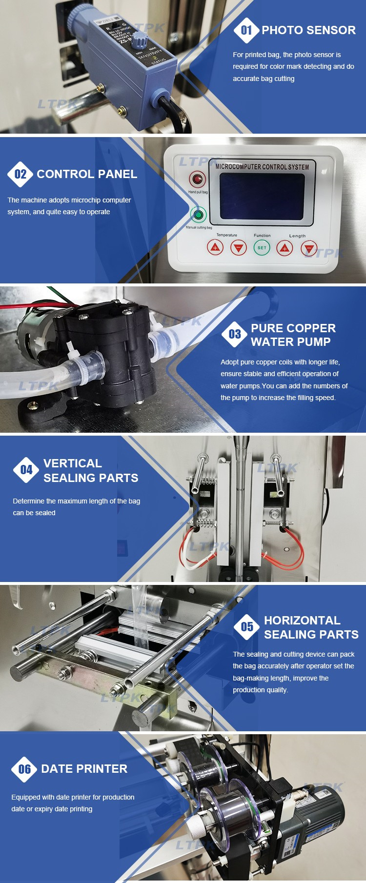 Pure liquid bag packing machine is controlled by microchip computer and assisted with high precision sensor. It’s able to weighing, filling and packaging in swift and steady way. The structure of this machine is concise and simple, easy to use and able to switch different size of bag former to satisfy different packaging requirement.